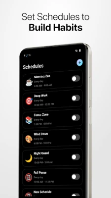 - Schedules: Set personalized schedules for your focus periods, allowing them to start and end automatically.