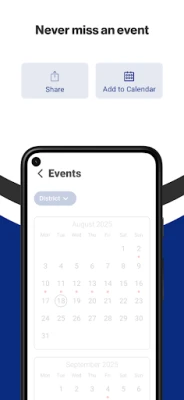 NEVER MISS AN EVENT The event section shows a list of events throughout the district. Users can add an event to their calendar and share the event with friends and family with one tap.
