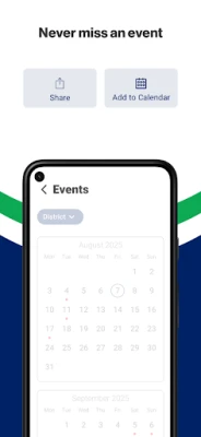 NEVER MISS AN EVENT The event section shows a list of events throughout the district. Users can add an event to their calendar to share the event with friends and family with one tap.