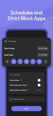 Flexible settings for different days of the week and hours of the day, tailored per app.